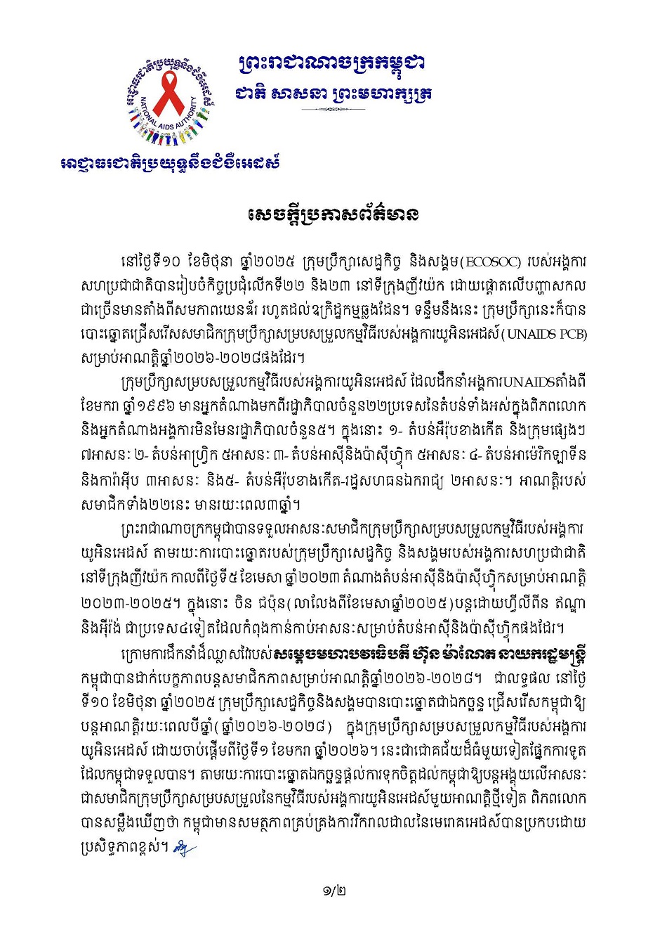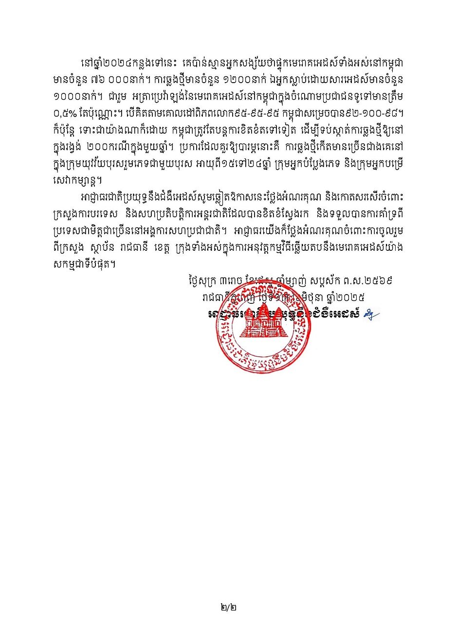 Posted inUncategorized សេចក្តីប្រកាសព័ត៌មាន Posted by Admin-Kanel June 17, 2025 Admin-Kanel View All Posts Post navigation Previous Post ឯកឧត្តមទេសរដ្ឋមន្រ្តី អៀង មូលី ប្រធានអាជ្ញាធរជាតិប្រយុទ្ធនឹងជំងឺអេដស៍ អញ្ជើញជាអធិបតីដ៏ខ្ពង់ខ្ពស់ ដឹកនាំកិច្ចប្រជុំពេញអង្គអាជ្ញាធរជាតិប្រយុទ្ធនឹងជំងឺអេដស៍ លើកទី១ ឆ្នាំ២០២៥Next Postលិខិតសម្តេចកិត្តិព្រឹទ្ធបណ្ឌិត ប៊ុន រ៉ានី ហ៊ុនសែន ប្រធានកាកបាទក្រហមកម្ពុជាឆ្លើយតបចំពោះលិខិតថ្លែងអំណរគុណរបស់លោកជំទាវ Winnie Byanyima អគ្គលេខាធិការរងអង្គការសហប្រជាជាតិ និងជានាយិកាប្រតិបត្តិអង្គការយូអិនអេដស៍
