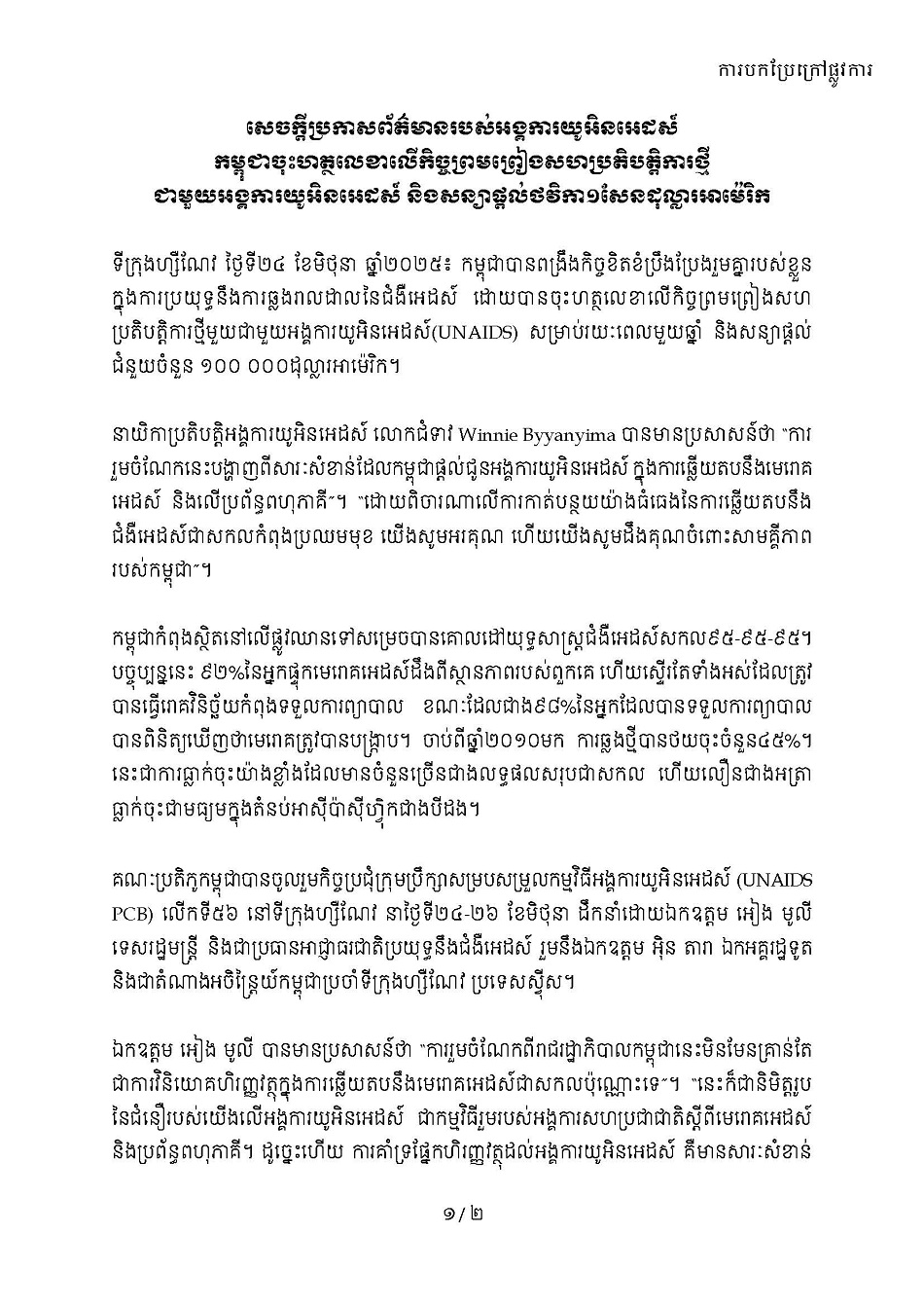សេចក្តីប្រកាស​ព័ត៌មាន​របស់​អង្គការ​យូអិនអេដស៍ កម្ពុជា​ចុះហត្ថលេខា​លើកិច្ចព្រមព្រៀង​សហប្រតិបត្តិការថ្មី ជាមួយ​អង្គការ​យូអិនអេដស៍ និងសន្យា​ផ្តល់ថវិកា​១សែនដុល្លារ​អាម៉េរិក