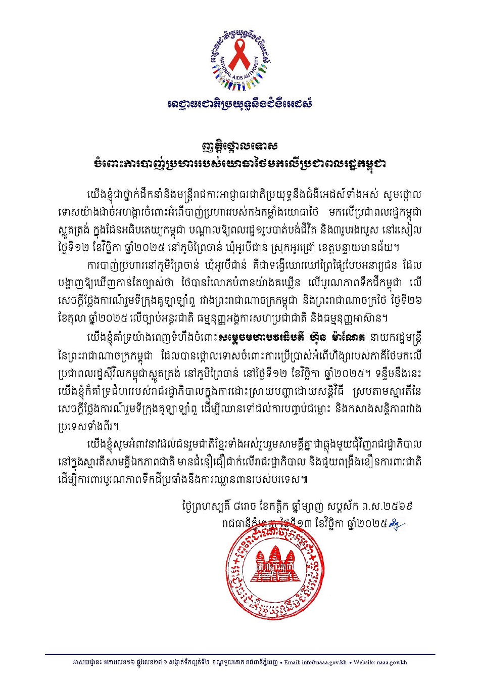 Posted inUncategorized ញត្តិថ្កោលទោស ចំពោះការបាញ់ប្រហាររបស់យោធាថៃមកលើប្រជាពលរដ្ឋកម្ពុជា Posted by Admin-Kanel November 19, 2025 Admin-Kanel View All Posts Post navigation Previous Post ឯកឧត្តមទេសរដ្ឋមន្ត្រី អៀង មូលី បានអញ្ជើញជាអធិបតីដ៏ខ្ពង់ខ្ពស់ ក្នុងវេទិការសាធារណៈ ដើម្បីត្រួតពិនិត្យ និងគាំទ្រការអនុវត្តកម្មវិធីនយោបាយនិងយុទ្ធសាស្រ្តបញ្ចកោណដំណាក់កាលទី១ របស់ក្រុមការងារ រាជរដ្ឋាភិបាលចុះមូលដ្ឋានស្រុកបសេដ្ឋ ខេត្តកំពង់ស្ពឺNext Postឯកឧត្តមទេសរដ្ឋមន្រ្តី អៀងមូលី អញ្ជើញជាអធិបតី ដឹកនាំពិធីជួបសំណេះសំណាលជាមួយគណៈកម្មាធិការប្រយុទ្ធនឹងជំងឺអេដស៍ ក្រសួងសុខាភិបាលដែលបានកែសម្រួលសមាសភាពថ្មី