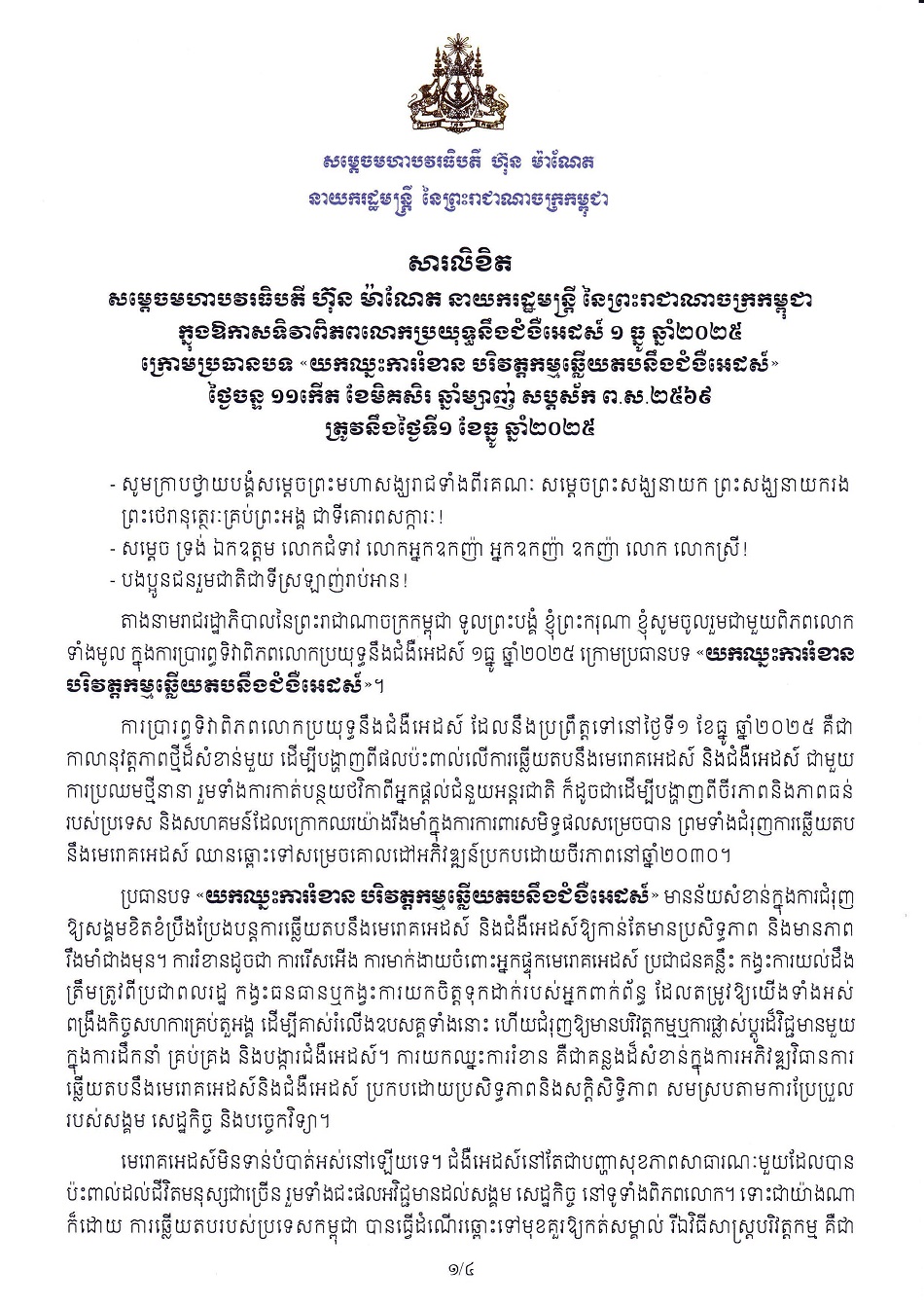 Posted inUncategorized សារលិខិត សម្តេចមហាបវរធិបតី ហ៊ុន ម៉ាណែត នាយករដ្ឋមន្ត្រី នៃព្រះរាជាណាចក្រកម្ពុជា ក្នុងឱកាសទិវាពិភពលោកប្រយុទ្ធនឹងជំងឺអេដស៍ ១ ធ្នូ ឆ្នាំ២០២៥ ក្រោមប្រធានបទ «យកឈ្នះការរំខាន បរិវត្តកម្មឆ្លើយតបនឹងជំងឺអេដស៍» Posted by Admin-Kanel December 1, 2025 Admin-Kanel View All Posts Post navigation Previous Post ឯកឧត្តមទេសរដ្ឋមន្រ្តី អៀង មូលី ប្រធានអាជ្ញាធរជាតិប្រយុទ្ធនឹងជំងឺអេដស៍ អញ្ជើញជាអធិបតីដ៏ខ្ពង់ខ្ពស់ ដឹកនាំសន្និបាតអាជ្ញាធរជាតិប្រយុទ្ធនឹងជំងឺអេដស៍ឆ្នាំ២០២៥Next Postទិវាពិភពលោកប្រយុទ្ធនឹងជំងឺអេដស៍ ១ធ្នូ ឆ្នាំ២០២៥ ក្រោមអធិបតីភាពដ៏ខ្ពង់ខ្ពស់ ឯកឧត្តមឧបនាយករដ្ឋមន្ត្រី សុខ ចិន្តាសោភា តំណាងដ៏ខ្ពង់ខ្ពស់សម្តេចមហាបវរធិបតី ហ៊ុន ម៉ាណែត នាយករដ្ឋមន្ត្រីនៃព្រះរាជាណាចក្រកម្ពុជា