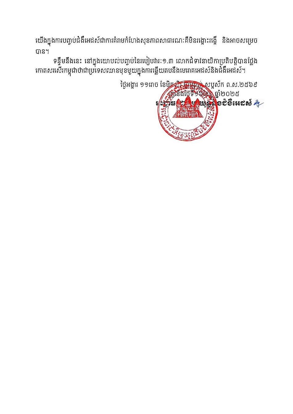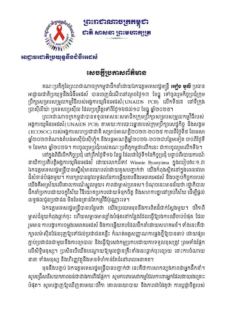 Posted inUncategorized សេចក្តីប្រកាសព័ត៌មាន គណៈប្រតិភូនៃព្រះរាជាណាចក្រកម្ពុជាដឹកនាំដោយឯកឧត្តមទេសរដ្ឋមន្ត្រី អៀង មូលី ប្រធានអាជ្ញាធរជាតិប្រយុទ្ធនឹងជំងឺអេដស៍ ទៅចូលរួមកិច្ចប្រជុំក្រុម ប្រឹក្សាសម្របសម្រួលកម្មវិធីរបស់អង្គការយូអិនអេដស៍ (UNAIDS PCB) លើកទី៥៧ នៅទីក្រុង ប្រាស៊ីលីយ៉ា ប្រទេសប្រេស៊ីល ដែលប្រព្រឹត្តទៅពីថ្ងៃ១៦ដល់១៨ ខែធ្នូ ឆ្នាំ២០២៥ Posted by Admin-Kanel December 23, 2025 Admin-Kanel View All Posts Post navigation Previous Post ញត្តិថ្កោលទោស សង្គ្រាមឈ្លានពានរបស់ថៃមកលើដែនអធិបតេយ្យកម្ពុជាNext Postសេចក្តីប្រកាសព័ត៌មាន គណៈប្រតិភូនៃព្រះរាជាណាចក្រកម្ពុជាដឹកនាំដោយឯកឧត្តមទេសរដ្ឋមន្ត្រី អៀង មូលី ប្រធាន អាជ្ញាធរជាតិប្រយុទ្ធនឹងជំងឺអេដស៍ កំពុងចូលរួមកិច្ចប្រជុំក្រុមប្រឹក្សាសម្របសម្រួលកម្មវិធីរបស់អង្គការ យូអិនអេដស៍ (UNAIDS PCB) លើកទី៥៧ នៅទីក្រុងប្រាស៊ីលីយ៉ា ប្រទេសប្រេស៊ីល