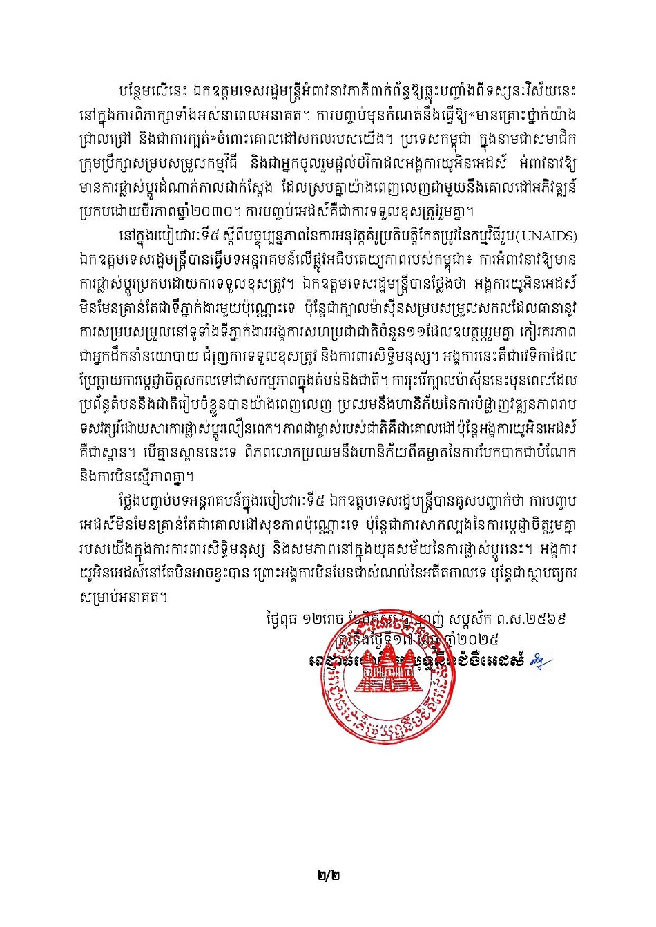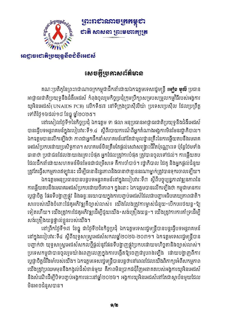 Posted inUncategorized សេចក្តីប្រកាសព័ត៌មាន គណៈប្រតិភូនៃព្រះរាជាណាចក្រកម្ពុជាដឹកនាំដោយឯកឧត្តមទេសរដ្ឋមន្ត្រី អៀង មូលី ប្រធាន អាជ្ញាធរជាតិប្រយុទ្ធនឹងជំងឺអេដស៍ កំពុងចូលរួមកិច្ចប្រជុំក្រុមប្រឹក្សាសម្របសម្រួលកម្មវិធីរបស់អង្គការ យូអិនអេដស៍ (UNAIDS PCB) លើកទី៥៧ នៅទីក្រុងប្រាស៊ីលីយ៉ា ប្រទេសប្រេស៊ីល Posted by Admin-Kanel December 23, 2025 Admin-Kanel View All Posts Post navigation Previous Post សេចក្តីប្រកាសព័ត៌មាន គណៈប្រតិភូនៃព្រះរាជាណាចក្រកម្ពុជាដឹកនាំដោយឯកឧត្តមទេសរដ្ឋមន្ត្រី អៀង មូលី ប្រធានអាជ្ញាធរជាតិប្រយុទ្ធនឹងជំងឺអេដស៍ ទៅចូលរួមកិច្ចប្រជុំក្រុម ប្រឹក្សាសម្របសម្រួលកម្មវិធីរបស់អង្គការយូអិនអេដស៍ (UNAIDS PCB) លើកទី៥៧ នៅទីក្រុង ប្រាស៊ីលីយ៉ា ប្រទេសប្រេស៊ីល ដែលប្រព្រឹត្តទៅពីថ្ងៃ១៦ដល់១៨ ខែធ្នូ ឆ្នាំ២០២៥Next Postញត្តិថ្កោលទោស សង្គ្រាមឈ្លានពានរបស់ថៃមកលើអធិបតេយ្យភាពនៃព្រះរាជាណាចក្រកម្ពុជា