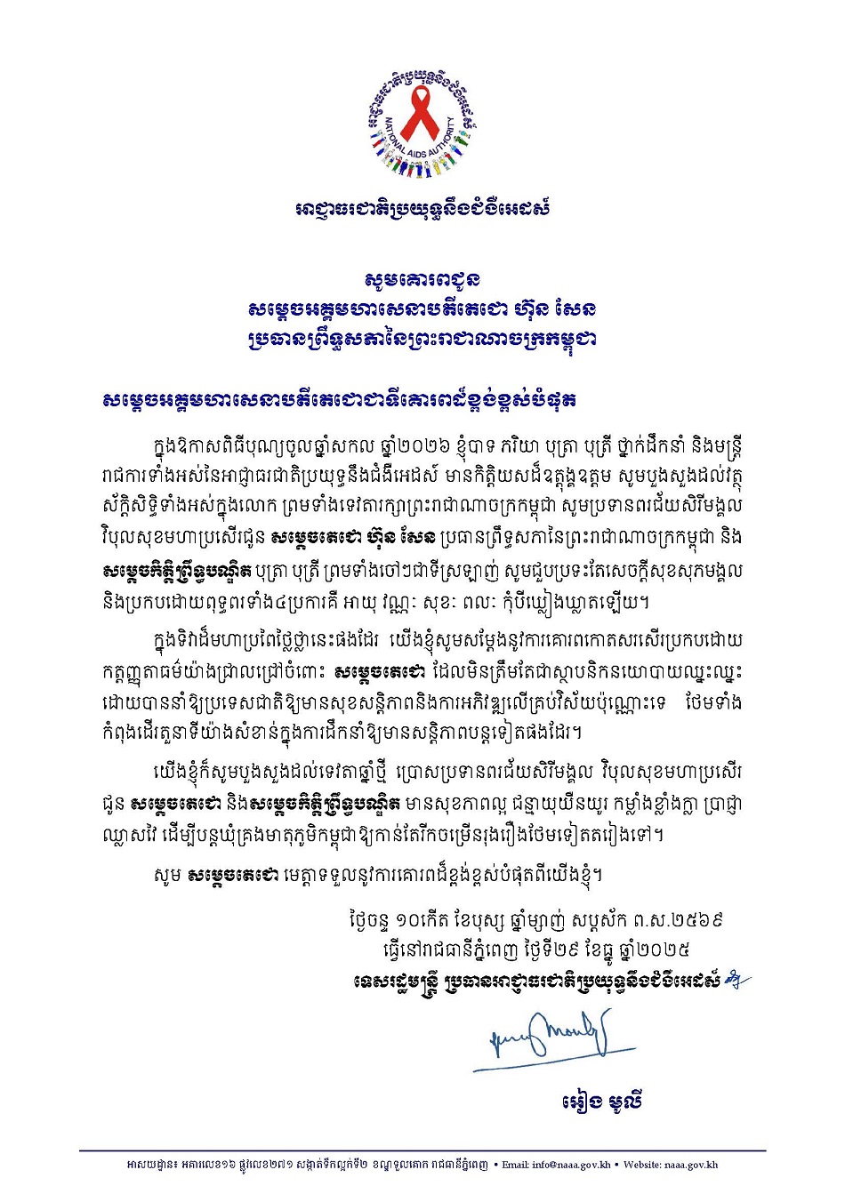 Posted inUncategorized លិខិតគោរពជូនពរសម្ដេចអគ្គមហាសេនាបតីតេជោ ហ៊ុន សែន ប្រធានព្រឹទ្ធសភានៃព្រះរាជាណាចក្រកម្ពុជា ក្នុងឱកាសពិធីបុណ្យចូលឆ្នាំសកល ឆ្នាំ២០២៦ Posted by Admin-Kanel January 5, 2026 Admin-Kanel View All Posts Post navigation Previous Post សារលិខិតថ្វាយព្រះពរព្រះបាទសម្ដេចព្រះបរមនាថ នរោត្តម សីហមុនី ព្រះមហាក្សត្រនៃព្រះរាជាណាចក្រកម្ពុជា និងសម្ដេចព្រះមហាក្សត្រី នរោត្តម មុនិនាថ សីហនុ ព្រះវររាជមាតាជាតិខ្មែរ ក្នុងឱកាសពិធីបុណ្យចូលឆ្នាំសកល ឆ្នាំ២០២៦Next Postលិខិតគោរពជូនពរសម្ដេចមហាបវរធិបតី ហ៊ុន ម៉ាណែត នាយករដ្ឋមន្រ្តី នៃព្រះរាជាណាចក្រកម្ពុជា និងលោកជំទាវបណ្ឌិត ក្នុងឱកាសពិធីបុណ្យចូលឆ្នាំសកល ឆ្នាំ២០២៦